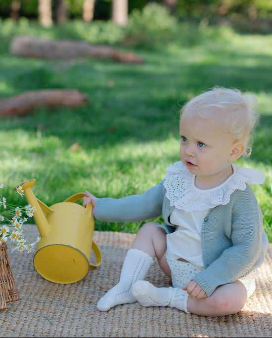 A classic style blouse featured with embroidered lace collar and long sleeves with elastics. This blouse is made from the softest organic cotton. It’s finished with mother-of-pearl buttons at the back that made easy to dress your little ones. Style it with our floral nappy cover for a sweet look outfit. Details: Entirely made by hand. Natural mother-of-pearl buttons. Machine washable on a delicate and/or cool setting. Sizes from 0 months to 2 years.