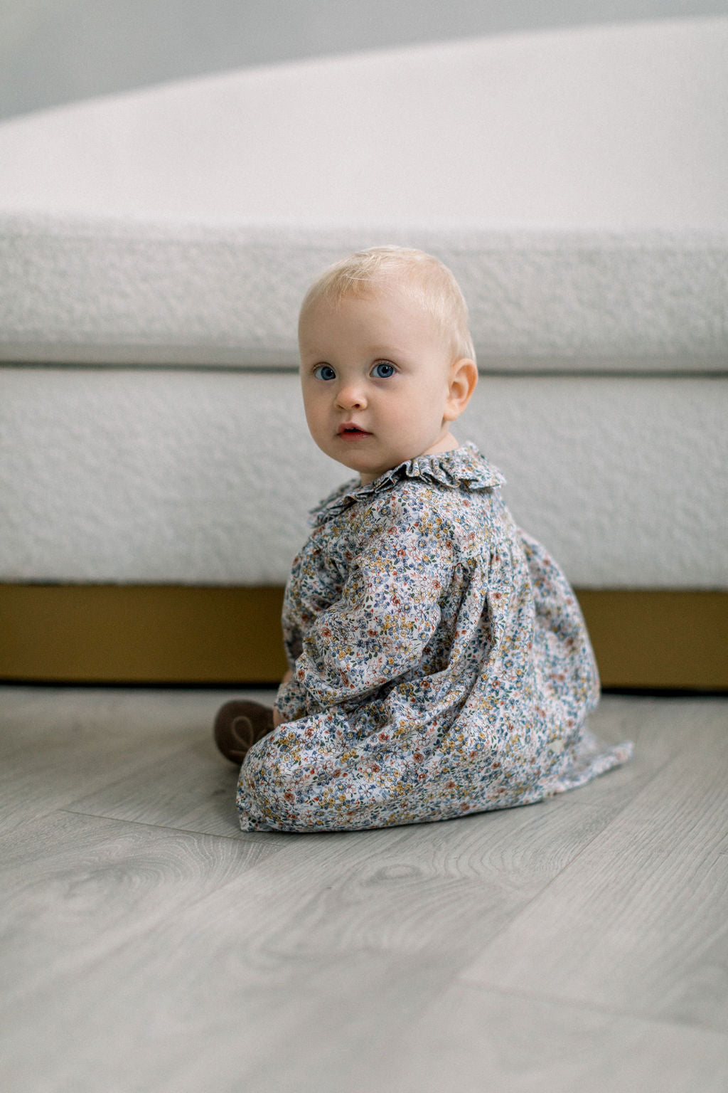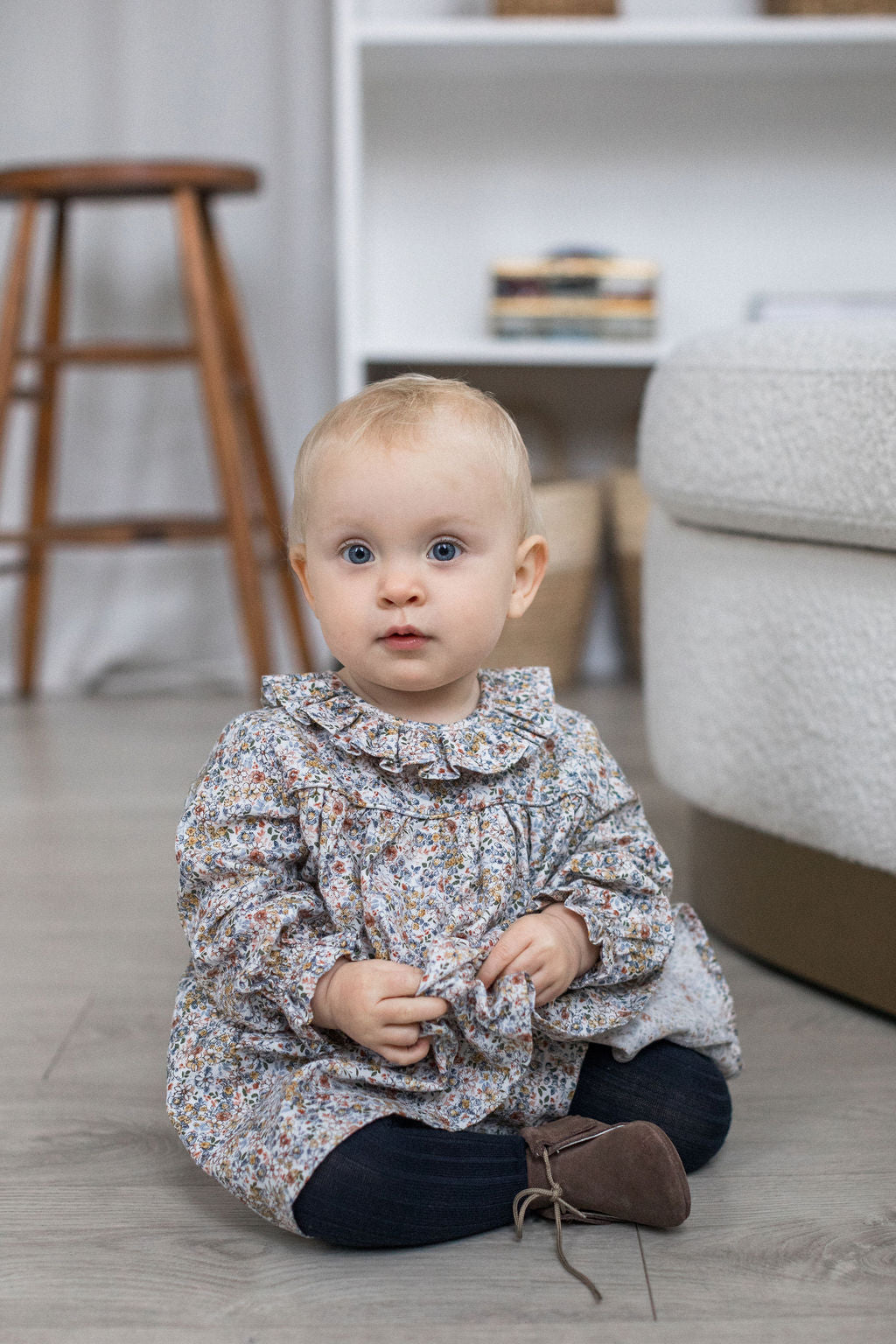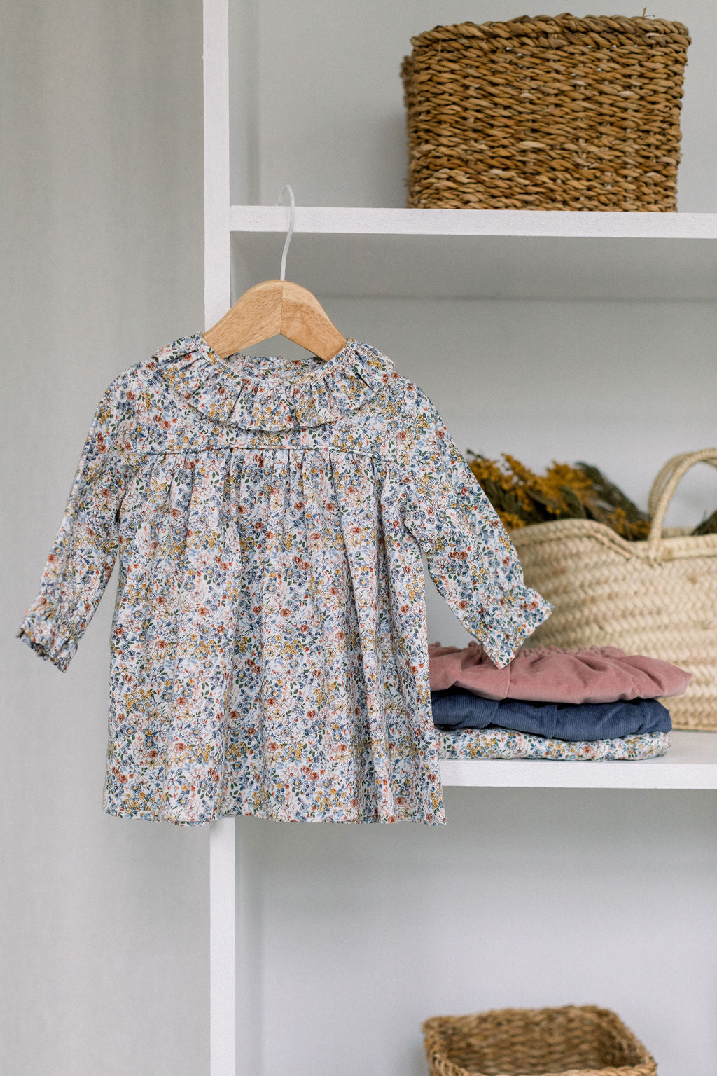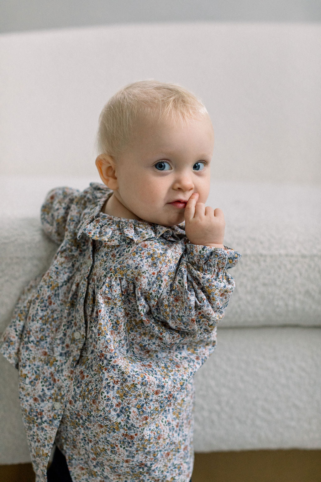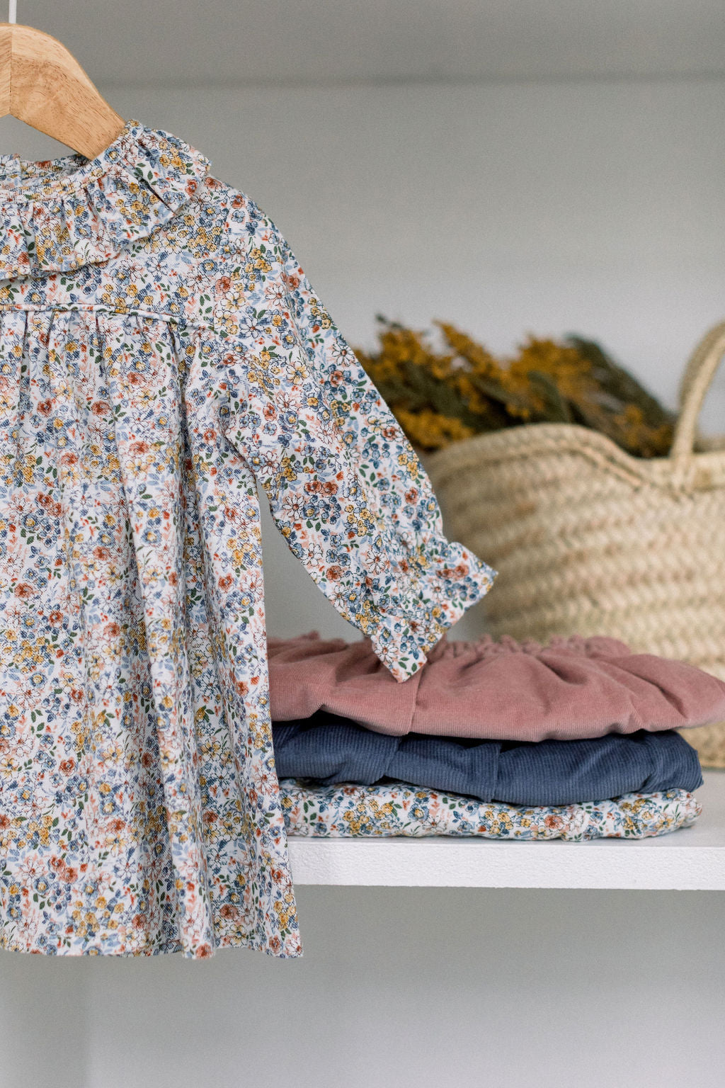 A classic style blouse featured with ruffle collar and long sleeves with elastics. This blouse is made from the softest organic cotton. It’s finished with mother-of-pearl buttons at the back that made easy to dress your little ones. Style it with our blue, pink or floral nappy cover for a sweet look outfit. Details: Entirely made by hand. Natural mother-of-pearl buttons. Machine washable on a delicate and/or cool setting. Sizes from 0 months to 2 years. COMPOSITION: 100% cotton.
