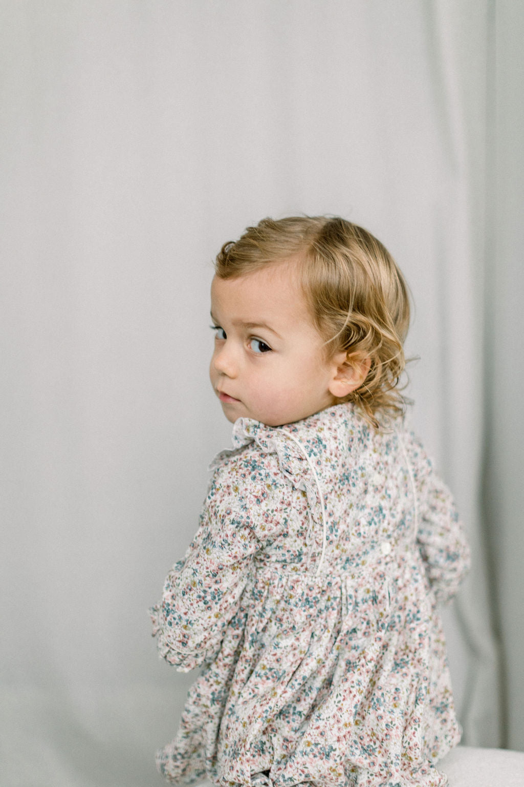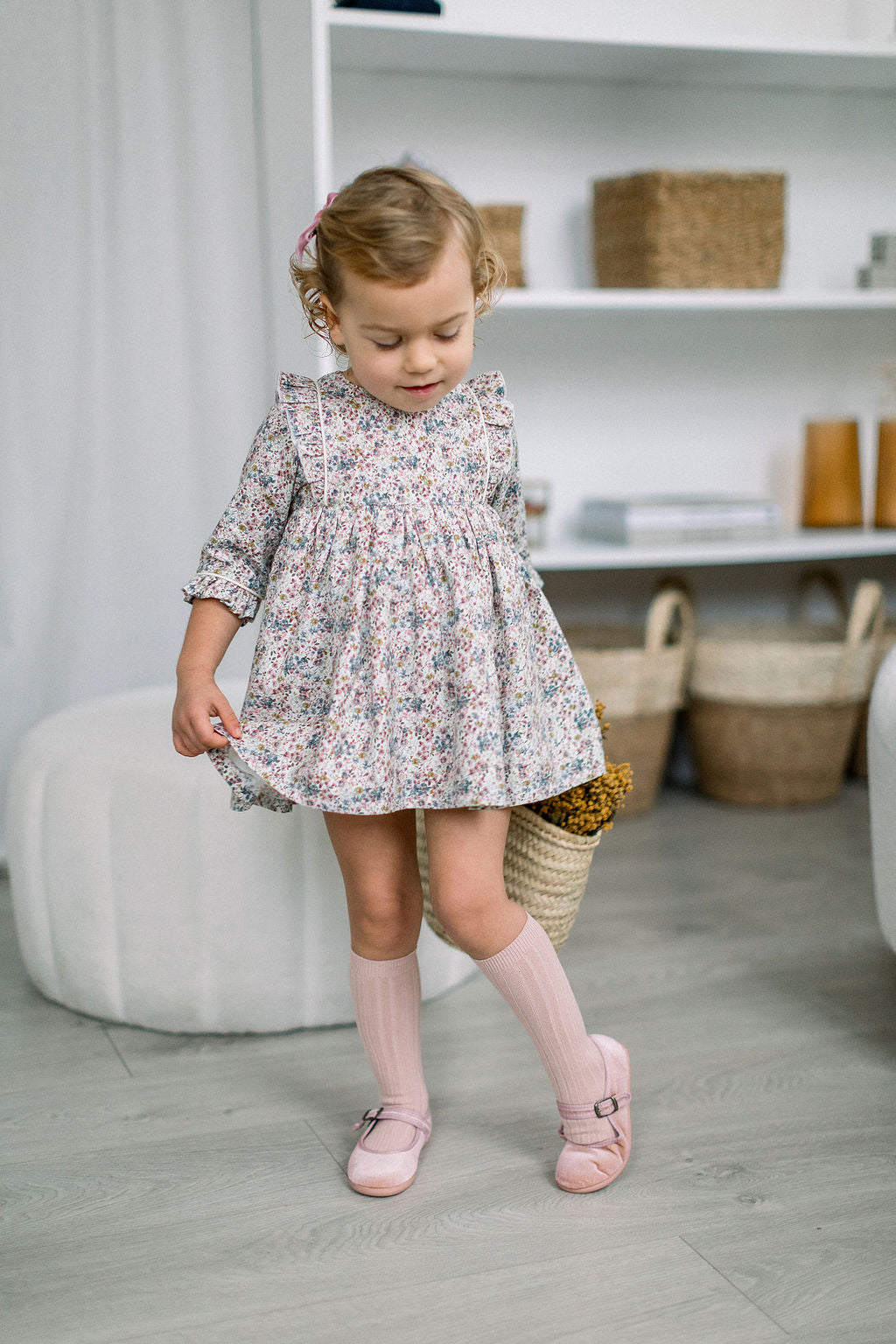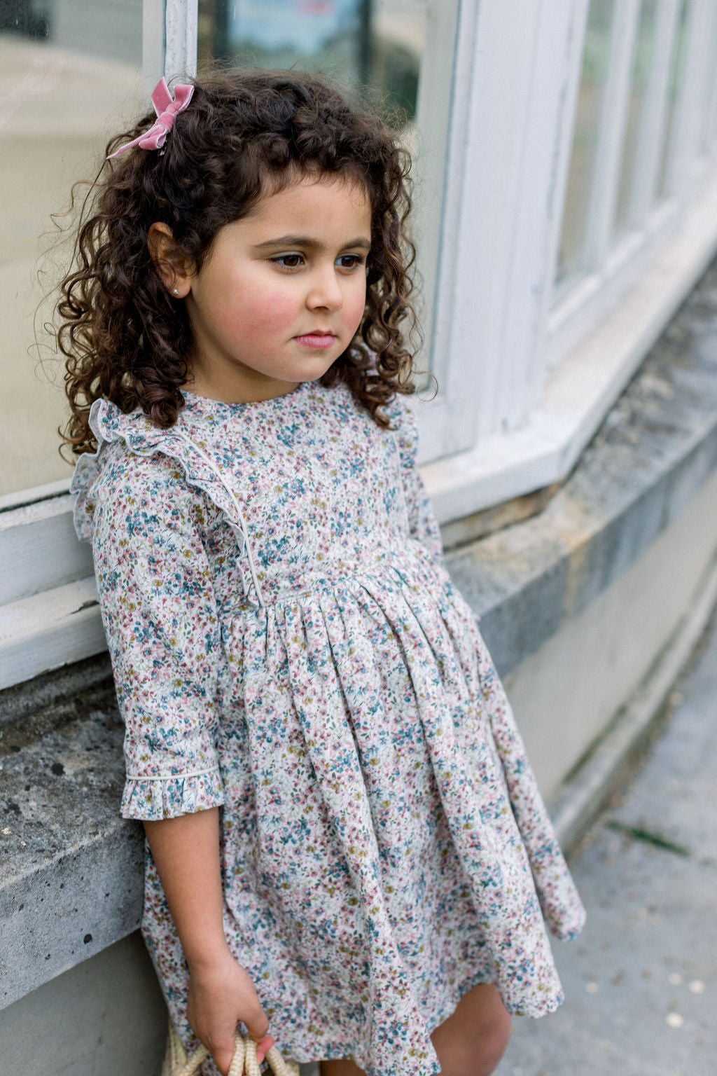 | This dress is one of the most elegant pieces of Roots collection. It features a traditional fit-and-flare silhouette, adorned with handmade frills at the sides and at the end of the three-quarter sleeves. Made with a beautiful floral fabric, mother of pearl buttons at the back. Fully lined with 100% organic cotton for an extra comfort in the coldest day. Details: - Entirely made by hand - Mother-of-pearl buttons at the back. - Fully lined with organic batiste fabric. - Fabric: vyela. - Size available from 2 year to 5 years. Composition: 100% cotton Responsibly designed and made in Spain |