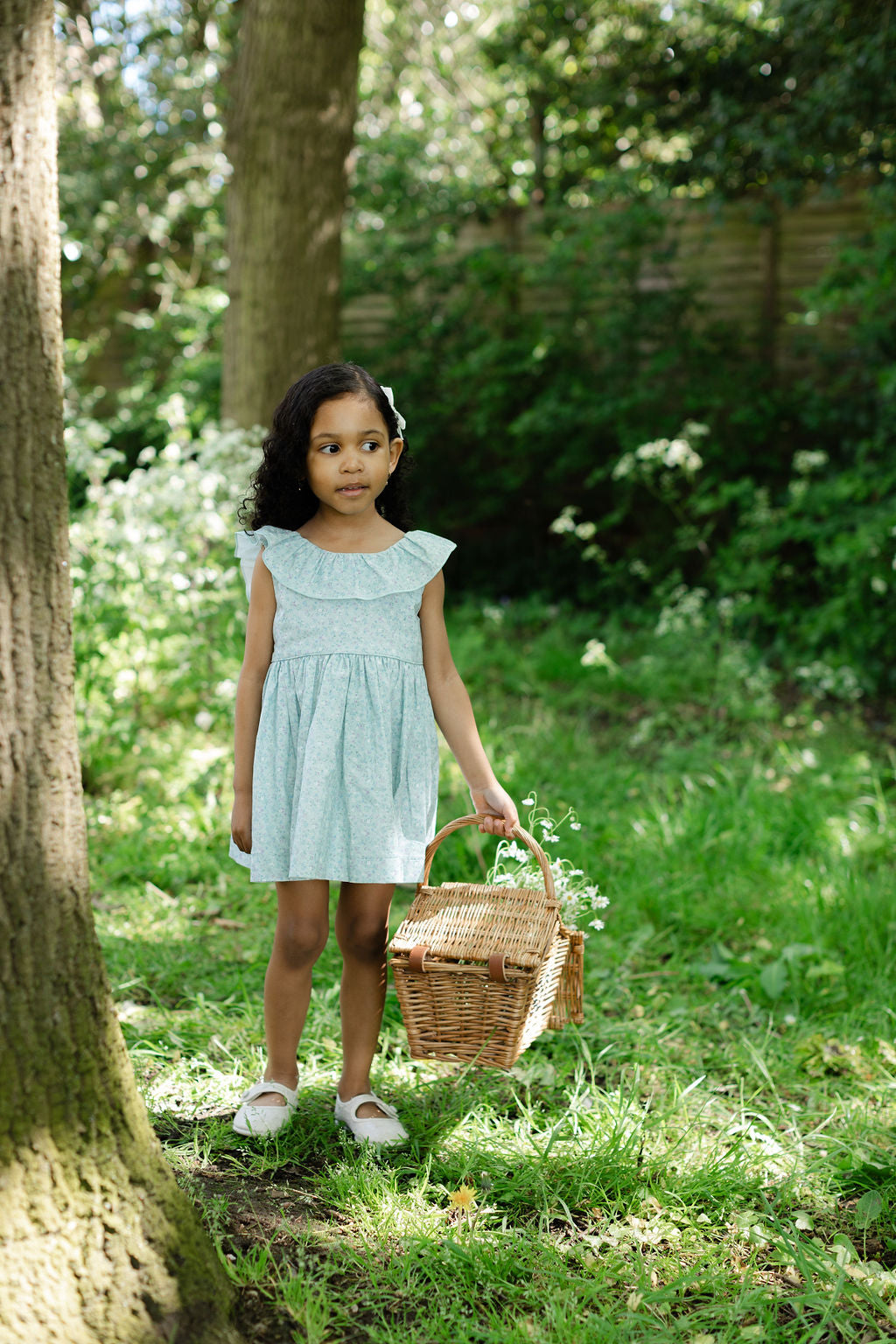 This delightful dress is made from beautiful floral green water fabric, perfect for any special occasion. It features a charming ruffle on the neck and a trim on the waistband, adding a touch of elegance.