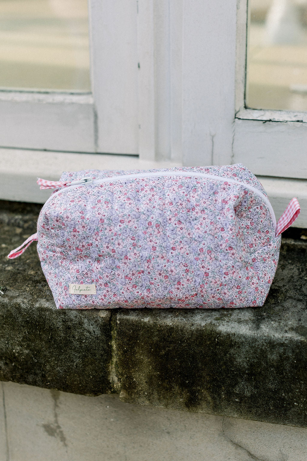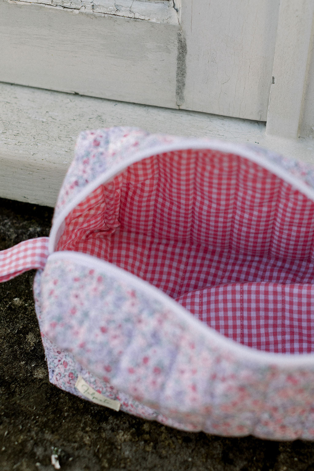 Floral toiletry bag with a matching gingham pattern inside, pairs perfectly with our weekend bag.