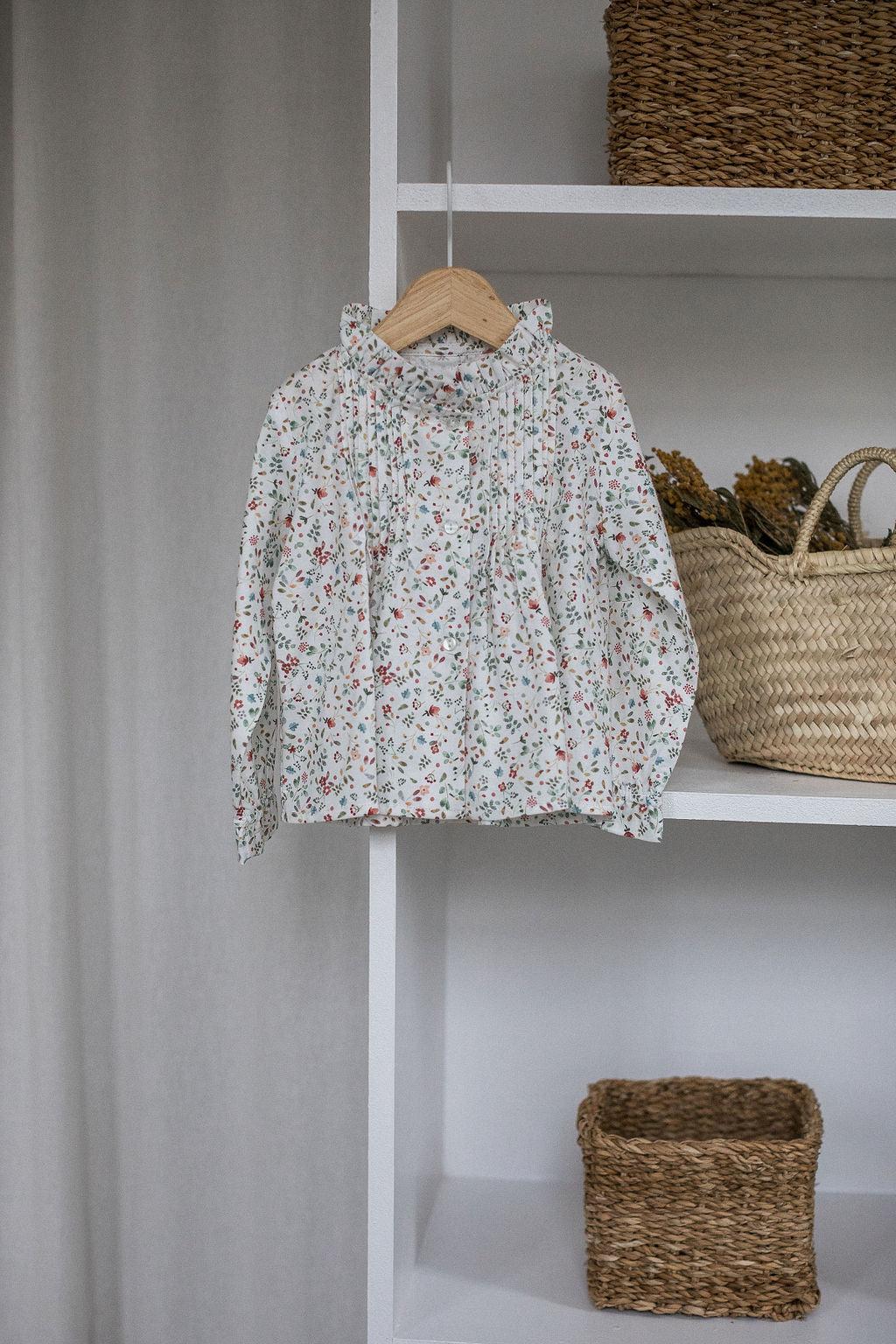 This smart blouse, features a sweet ruffle collar, elegant long sleeves with frill details, and a front-button opening. Its charming pattern adds a touch of sophistication to any ensemble. Available in 3 fabrics: blue, sunflower and leaves. |