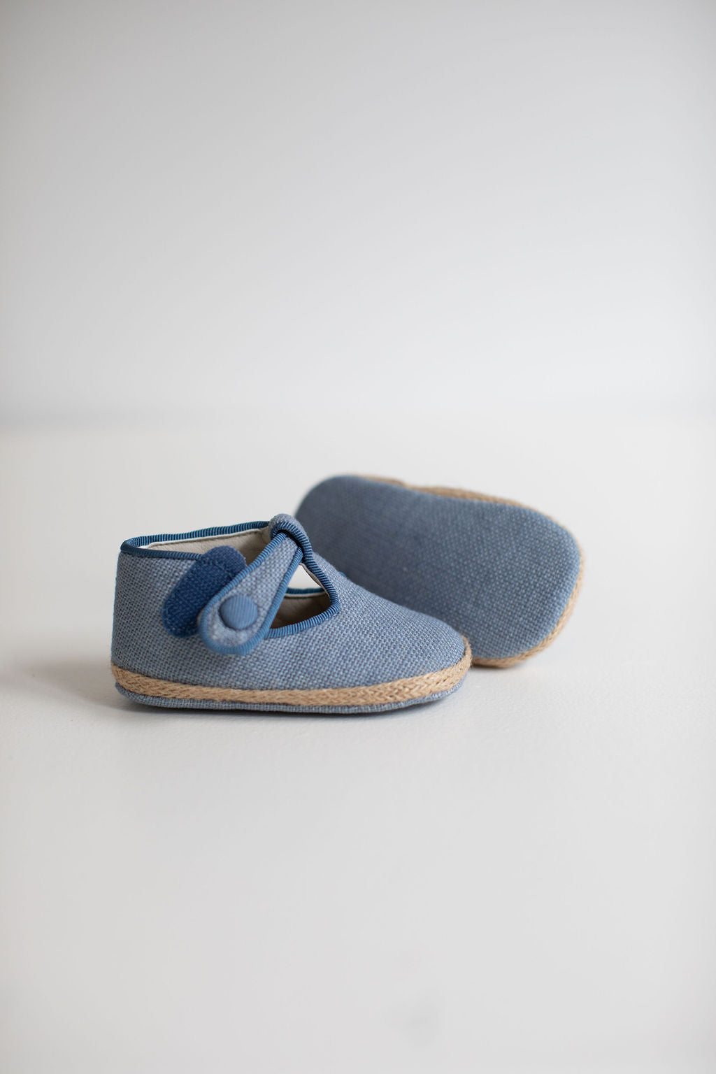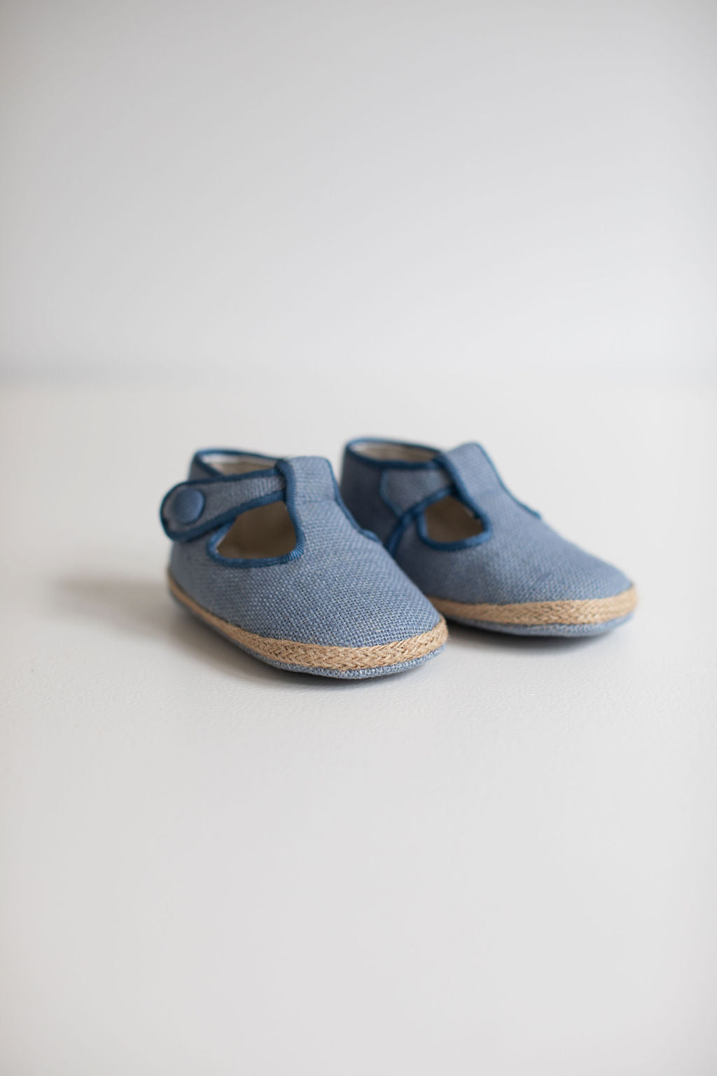 Sweet little T-bar pre-walker baby shoes in blue colour. Upper and sole crafted from 100% linen and inner leather for durability, a cushioned instep and a snap button fastening for easy on and off.