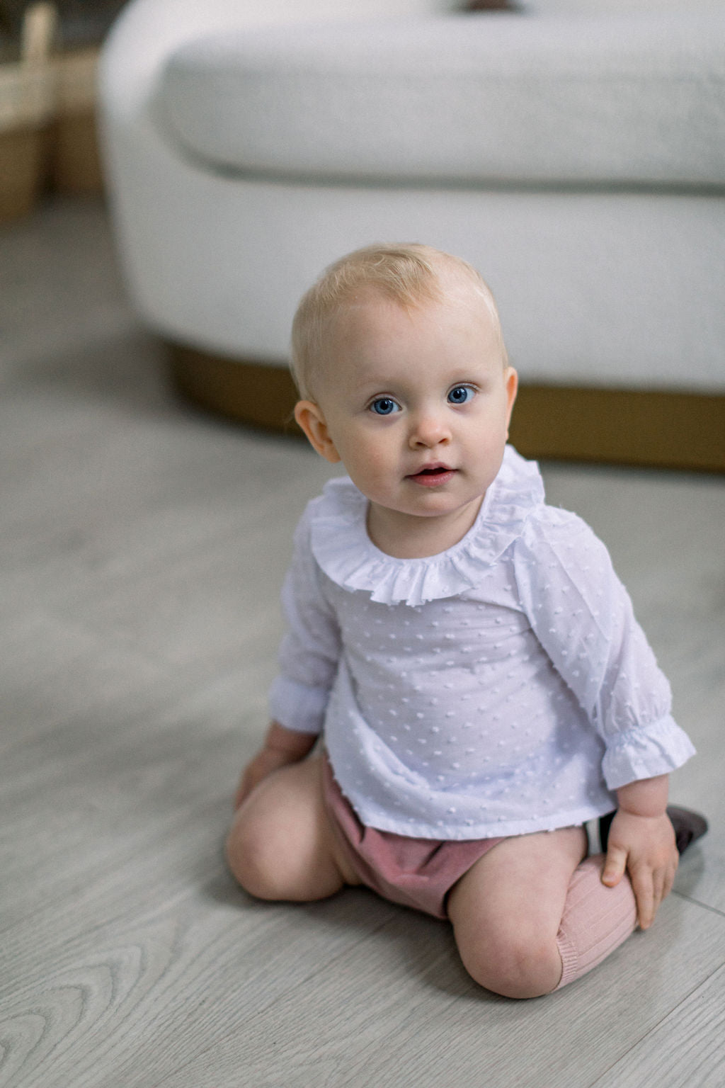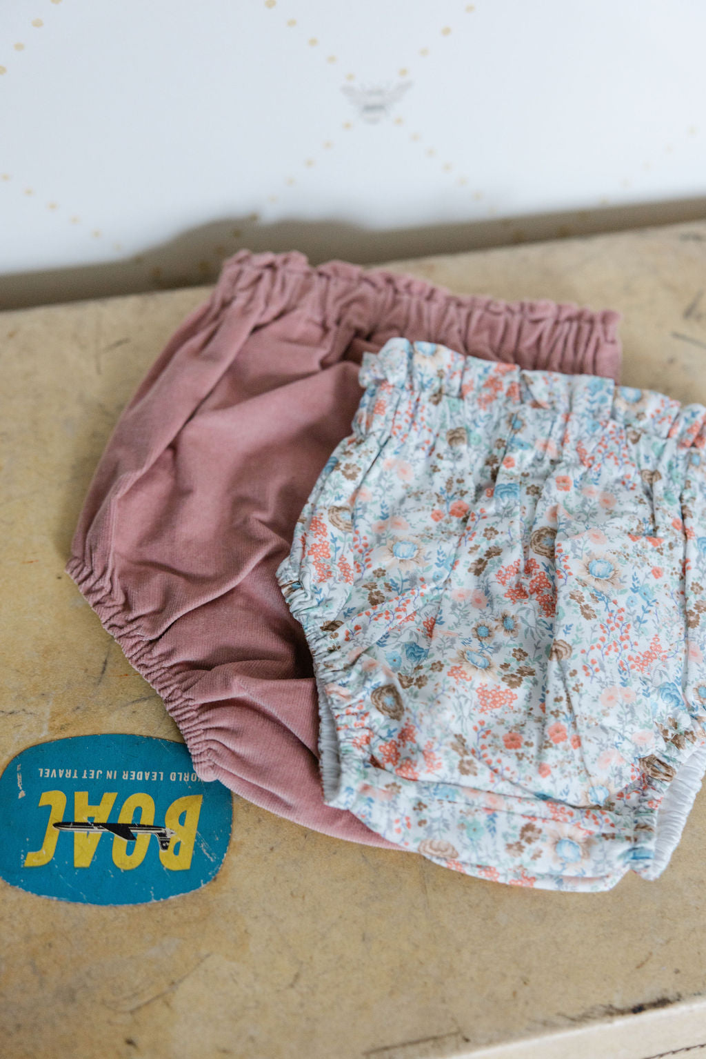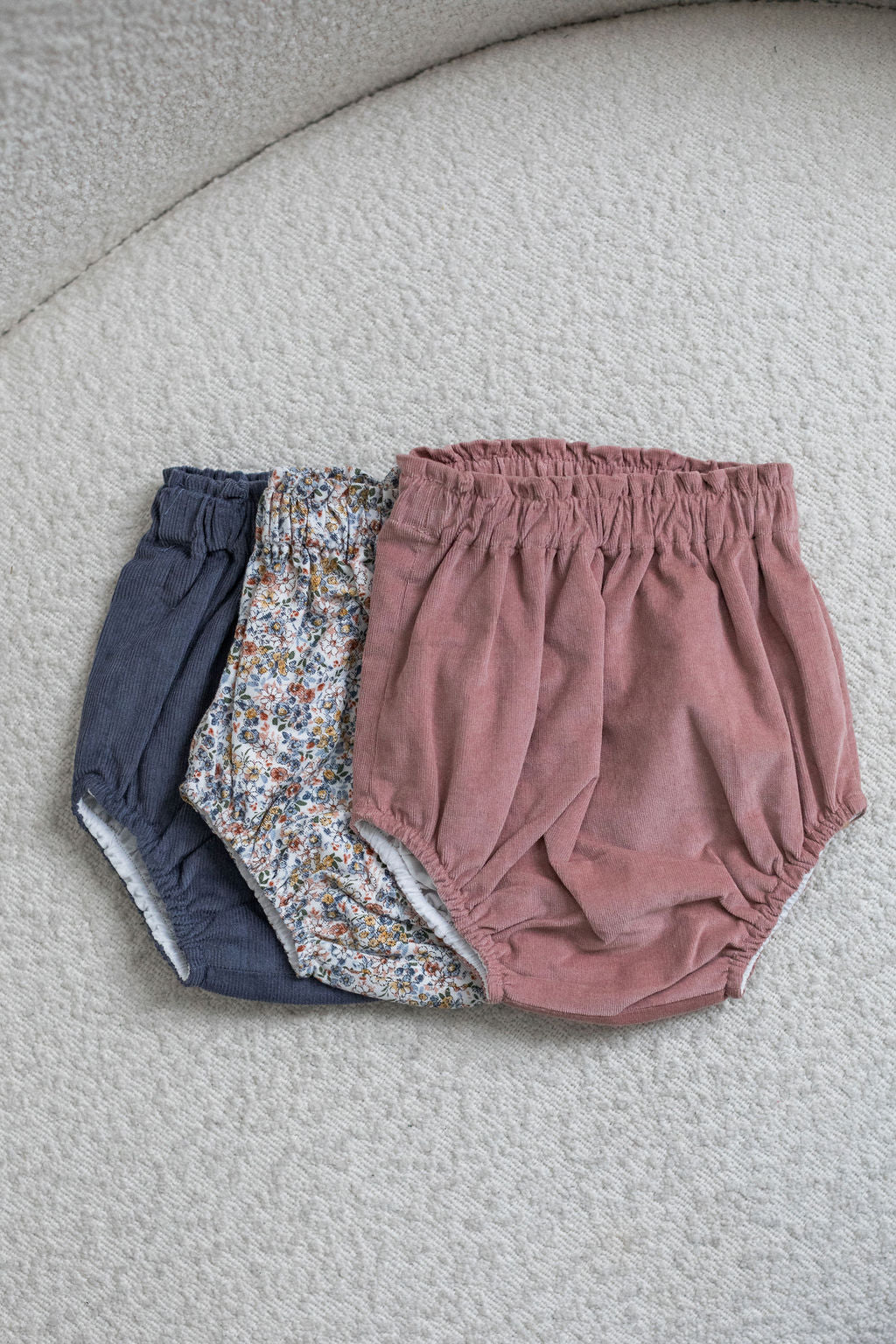 This high-waisted baby nappy cover is made from 100% cotton and fully lined. Beautiful fabrics, with soft band on the waist and legs. Versatile and very comfortable to wear. Available in blue and dusty pink corduroy fabric and floral cotton fabric. Style it with our baby floral blouse or dotted Swiss blouse.