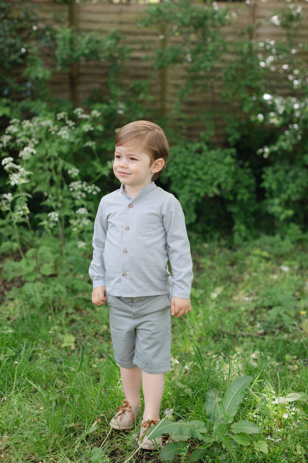Oxford kaki shirt for boys this winter. Crafted from 100% cotton, this shirt features a stylish mao collar, little front pocket and long sleeves. Adorned with natural coconut buttons fastened down the center front.